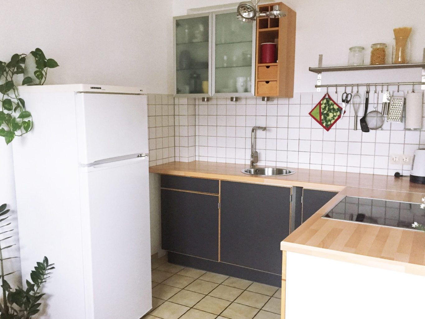 Die Küche ist voll ausgestattet mit großem Kühlschrank, Spülmaschine, Kaffeemaschine, Wasserkocher und was man sonst zum Kochen so braucht.