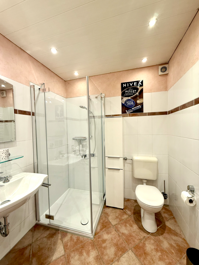 Das großzügige Badezimmer ist mit einer Dusche und einem Waschtrockner ausgestattet.